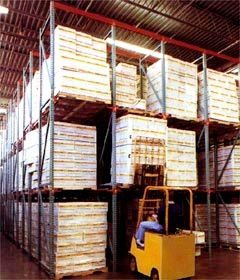 Se requieren únicamente dos pasillos, uno en cada extremo del bloque, y se trata de un sistema de alta densidad pero con muy poca selectividad, el ancho de los pasillos depende del ancho de las tarimas y del montacargas a utilizar en este tipo de racks.